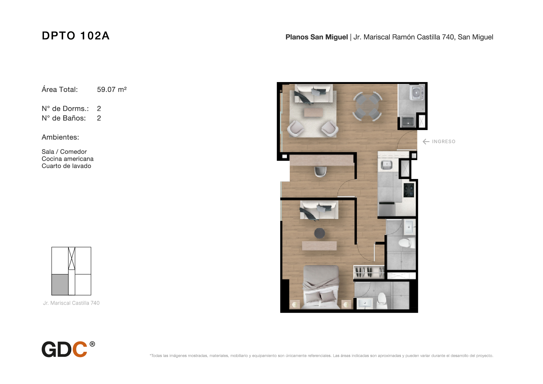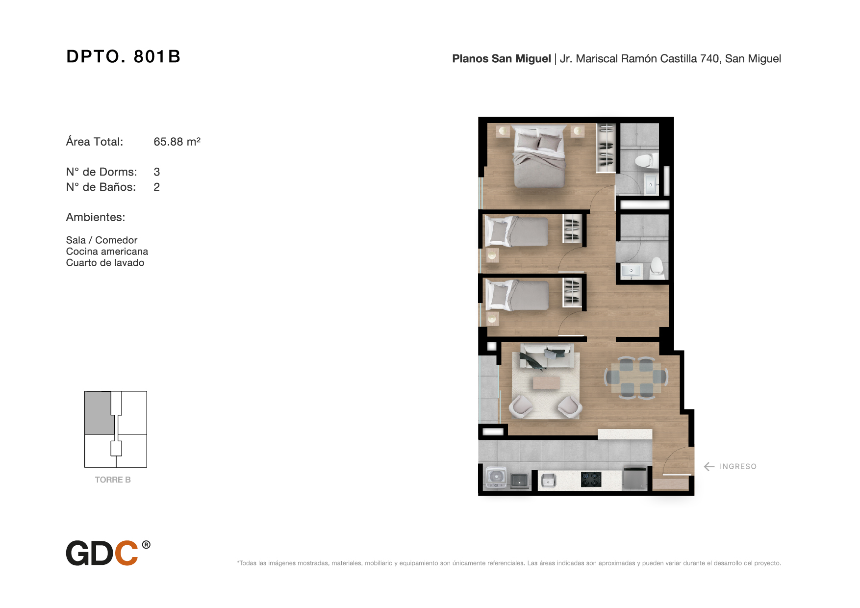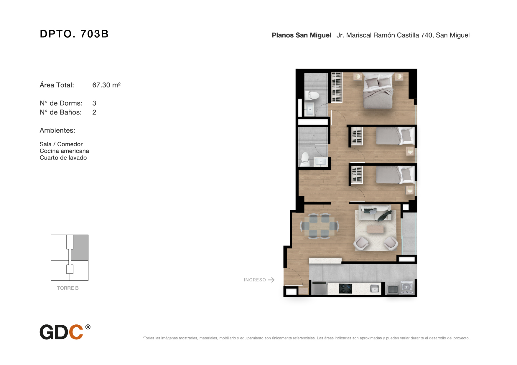 Hasta 67m2Un innovador y exclusivo complejo ubicado en Lima, Perú, creado con el objetivo de contribuir integralmente a su entorno gracias a su gran diseño, distribución de interiores, increíbles amenidades y concepto de vivienda sustentable, el cual se traduce en hacer uso de luz led, gas natural, riego por goteo y ahorro de agua de hasta el 30% en servicios sanitarios.